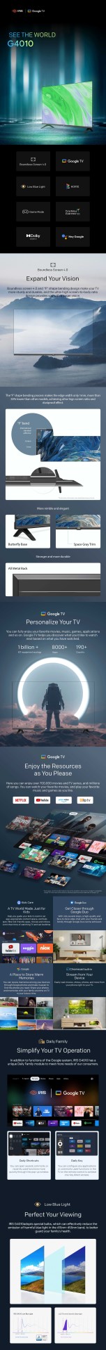 Boundless screen 4.0 and "F" shape bending design make your TV more sturdy and durable, and the ultra-high screen-to-body ratio design provides you with a larger vision.